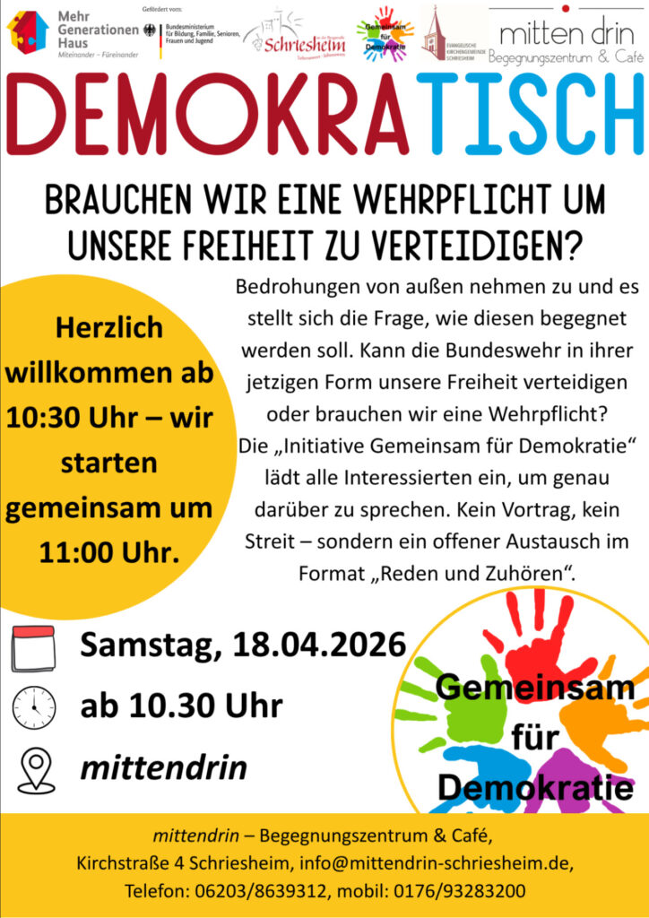 Wir von der Initiative Gemeinsam für Demokratie laden alle Interessierten am Samstag, den 18.04.2026 von 10.30 – 12:00 Uhr herzlich ins Café Mittendrin, Kirchstr.4 in Schriesheim, ein, um genau darüber zu sprechen.